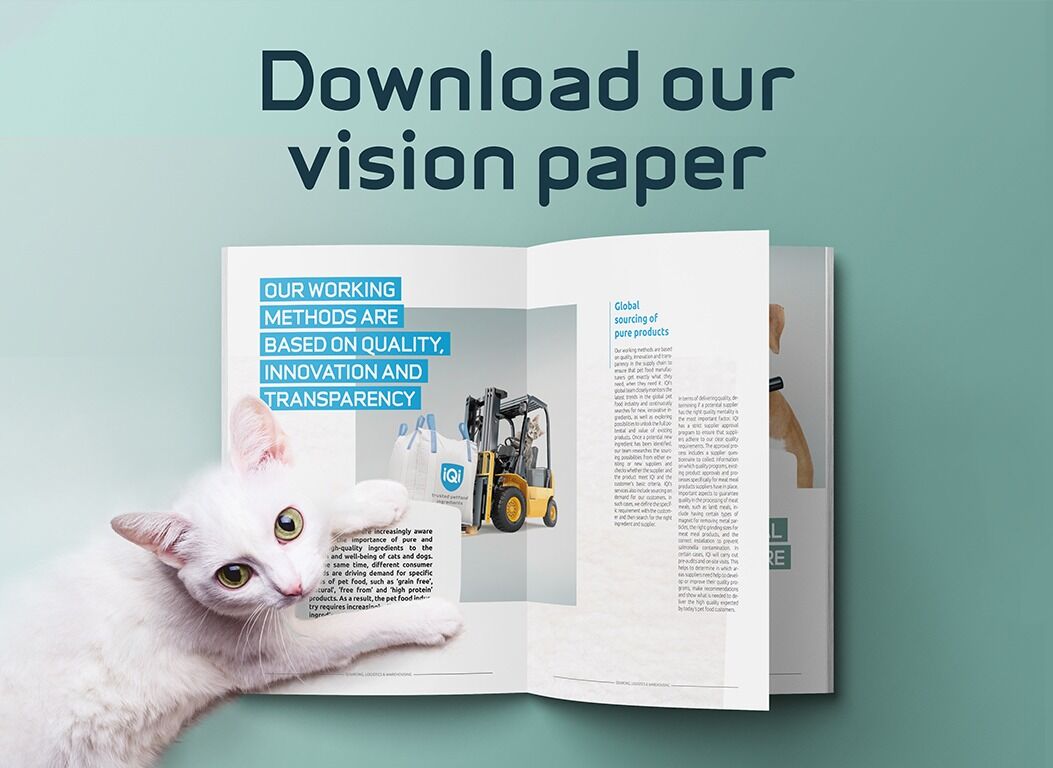 nutritional value, quality, cost, sustainability, animal welfare, technical properties, functionality, and specific benefits to the health and well-being of cats and dogs. A key factor in the sourcing process is identifying potential ingredients with the right characteristics to meet market demands. As a partner to the global pet food industry, IQI Trusted Petfood Ingredients offers dedicated solutions for the entire process from global sourcing of ingredients to warehousing, quality checks and improvements, logistics and on-time distribution.